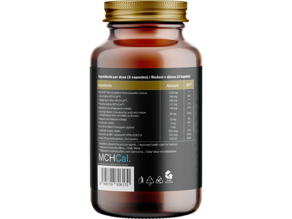Composizione: MCH-Cal™ idrossiapatite microcristallina di calcio, calcio (da MCH-Cal™), collagene di tipo I (da MCH-Cal™), fosforo (da MCH-Cal™), magnesio (come malato di magnesio), vitamina C liposomiale (come acido ascorbico) e miscela di fosfolipidi (da girasole non-OGM), potassio (come citrato di potassio), zinco (come citrato di zinco), boro (da Albion® boroorganico glicinato), rame (come citrato di rame), vitamina K2 come MK-7 all-trans K2 VITAL®DELTA, vitamina D3 (come colecalciferolo, da lanolina). Capsula vegetale a base di HPMC. Senza sostanze di riempimento.