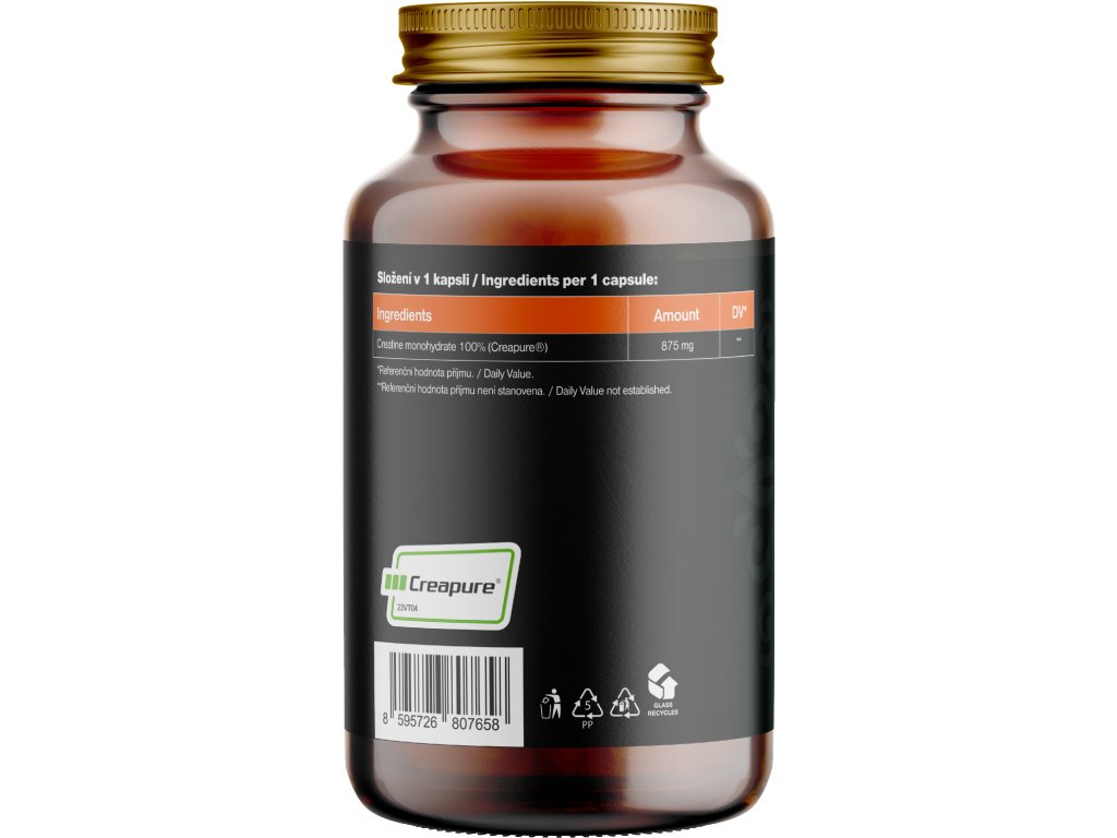 Composizione: Creatina monoidrato 100% (Creapure®) (875 mg). Capsula vegetale a base di HPMC. Senza sostanze di riempimento.
