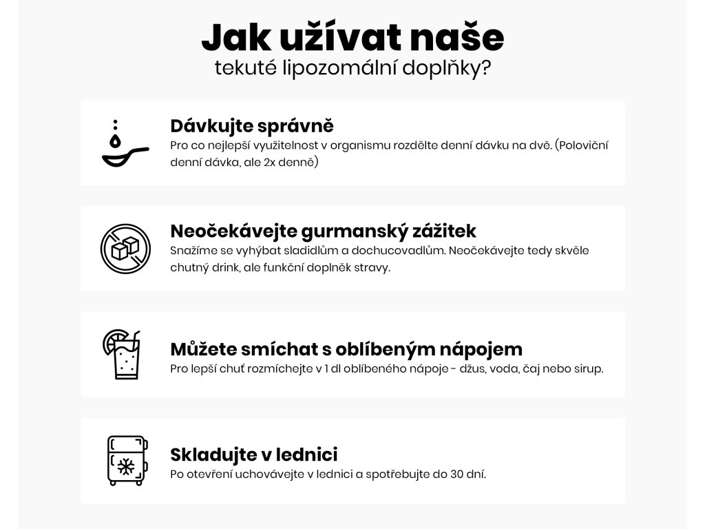 Conservazione: Conservare in frigorifero, consumare entro massimo 30 giorni dall'apertura. Non fare scorta di prodotti liposomiali. Sono migliori quando sono il più freschi possibile. Tenere fuori dalla portata dei bambini. Il prodotto non è destinato a bambini, donne in gravidanza o in allattamento. Non superare la dose giornaliera raccomandata. Il prodotto non è inteso come sostituto di una dieta variata. Mantenere uno stile di vita sano.