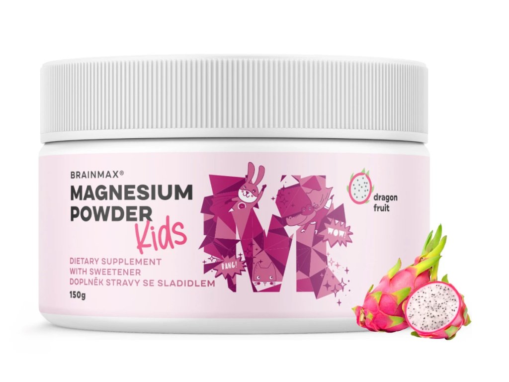 BrainMax KIDS Magnesium Powder, gusto frutto del drago, 150 g Magnesio per bambini al gusto dragon fruit, 30 dosi, integratore alimentare