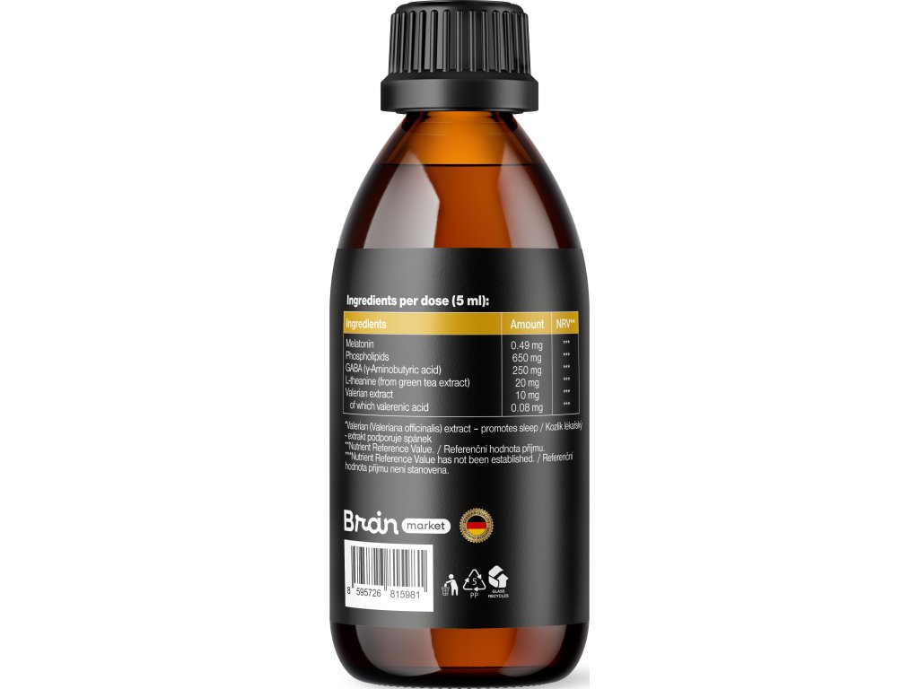 Ingredienti: Acqua, glicerolo, fosfolipidi (650 mg, VNR*), GABA (acido γ-amminobutirrico) (250 mg, VNR*), acido citrico, L-teanina (da estratto di tè verde) (20 mg, VNR*), aroma di melone giallo, estratto di valeriana (10 mg, VNR*) di cui acido valerenico (0,08 mg, VNR*), estratto di rosmarino (0,68 mg, VNR*) di cui acido carnosico (0,4 mg, VNR*), melatonina (0,49 mg, VNR*).