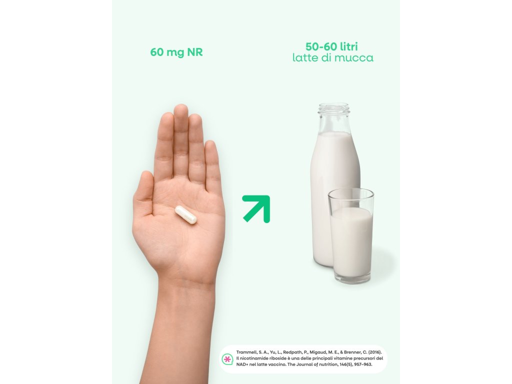 NR svolge un ruolo chiave nel metabolismo energetico1. NR in combinazione con i polifenoli, come il resveratrolo e la quercetina, crea una base complessa dei moderni protocolli di supplementazione. Una dose di 300 mg corrisponde a circa 100 mg di niacina. A differenza della niacina, non provoca arrossamenti della pelle ed è quindi adatto per un uso a lungo termine.