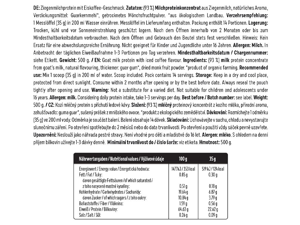 Composizione: (93 %) concentrato proteico di latte di capra, aroma naturale, addensante: gomma di guar*, polvere essiccata di frutto del monaco. *prodotto da agricoltura biologica. Allergene: latte.