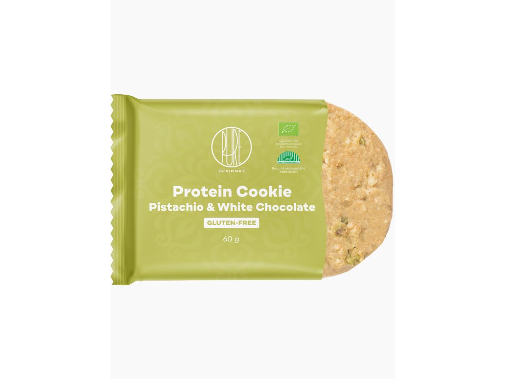 BrainMax Pure® Protein Cookie - Pistacchio e cioccolato bianco, BIO, 60 g Biscotto proteico con pistacchi e cioccolato bianco / Certificato *CZ-BIO-001