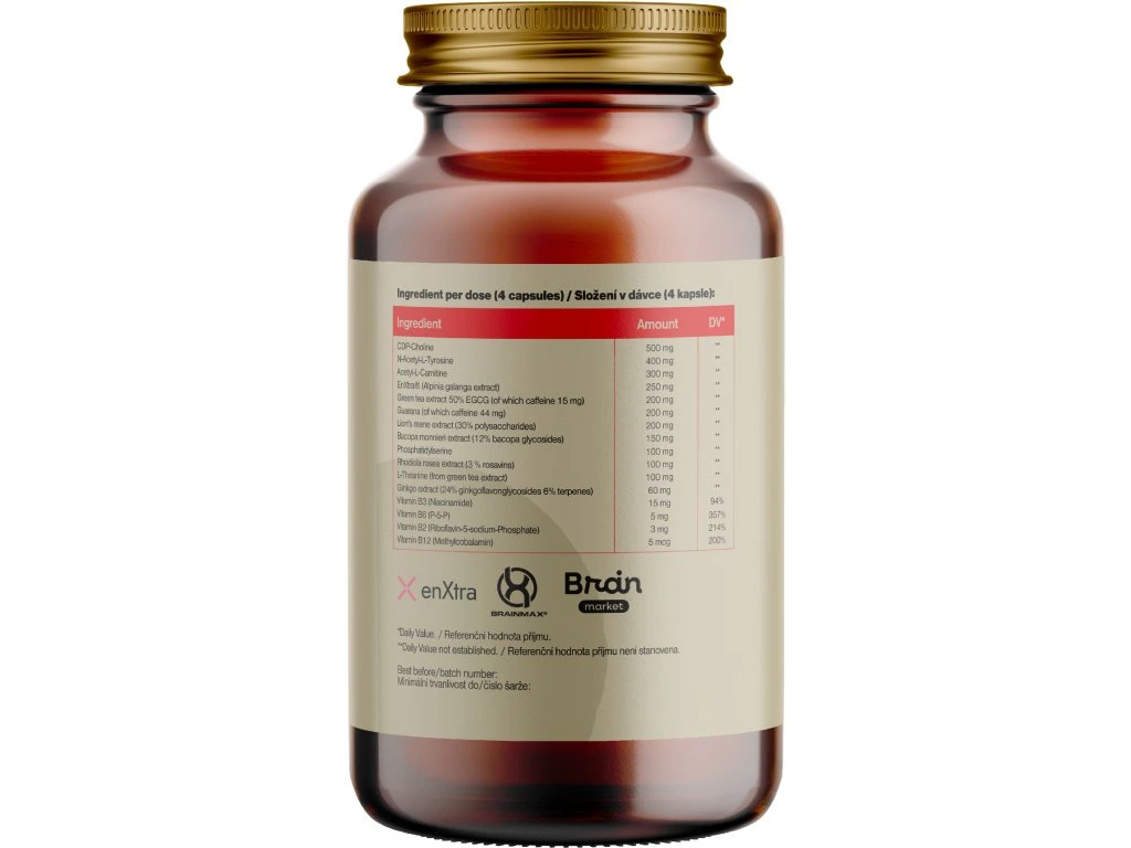 Composizione: CDP-colina, L-Tirosina, Acetil-L-Carnitina, EnXtra® (estratto di Alpinia galanga), cellulosa microcristallina, Estratto di tè verde 50% EGCG, Guaranà, estratto di Lion's mane (30% polisaccaridi), estratto di Bacopa monnieri (12% glicosidi di bacopa), Fosfatidilserina, estratto di Rhodiola rosea (3% rosavine), L-Teanina (dall'estratto di tè verde), estratto di Ginkgo (24% ginkgoflavonglicosidi 6% terpeni), Vitamina B3 (nicotinamide), Vitamina B6 (P-5-P), Vitamina B2 (riboflavina-5-fosfato di sodio) (3 mg), Vitamina B12 (metilcobalamina). Cellulosa microcristallina. Capsula vegetale a base di HPMC. Il prodotto non contiene glutine.