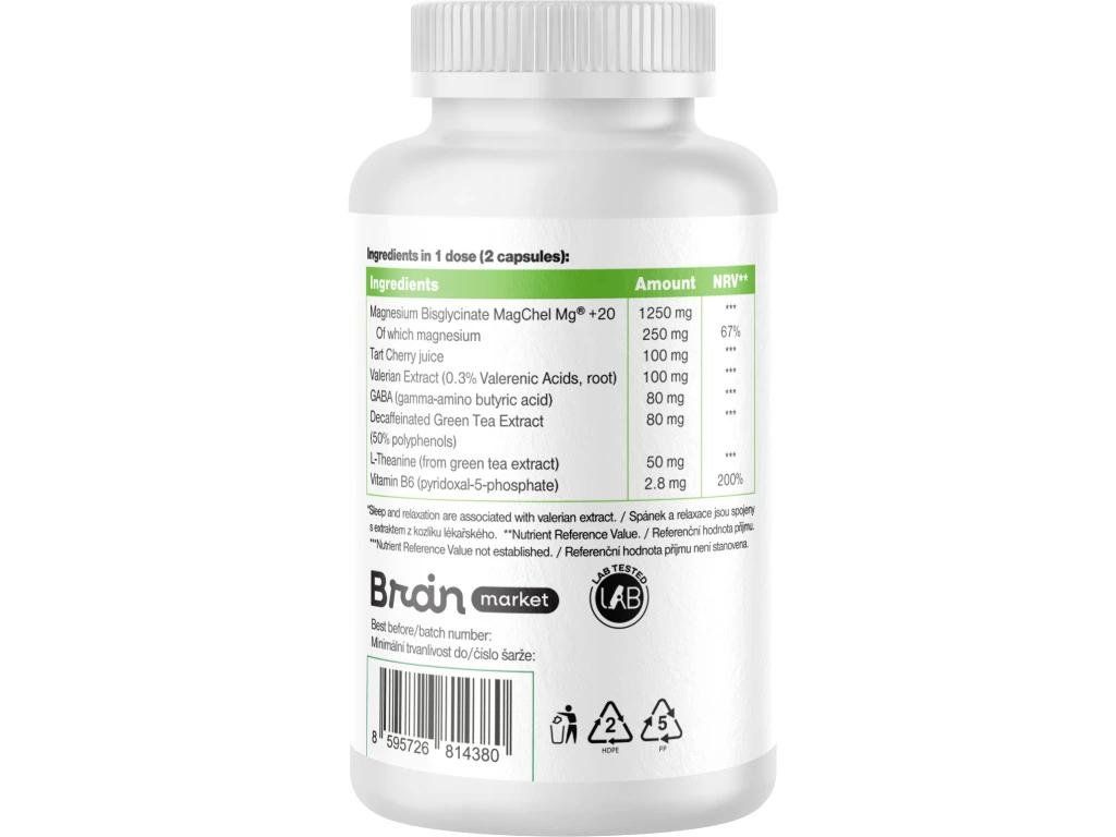 Composizione: Magnesio bisglicinato MagChel® Mg +20, 1250 mg di cui magnesio 250 mg, Prunus Cerasus (succo di ciliegie) 100 mg, Valeriana officinalis (0,3% acido valerenico, radice) 100 mg, GABA acido gamma-amminobutirrico 80 mg, Estratto di tè verde decaffeinato (50% polifenoli) 80 mg, L-teanina (da estratto di tè verde) 50 mg, Vitamina B6 Piridossal-5-fosfato 2,8 mg. Capsula vegetale a base di HPMC. Non contiene additivi (E-numeri).