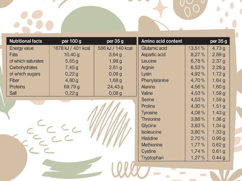 Gli amminoacidi sono una parte naturale delle proteine, che costituiscono la base di molte strutture corporee. Nel proteine vegano BrainMax troverai tutti e nove amminoacidi essenziali – leucina, isoleucina, valina, lisina, metionina, treonina, istidina, triptofano e fenilalanina. Grazie alla loro presenza naturale, questa proteina è considerata una fonte completa di proteine vegetali, che contribuisce alla crescita e al mantenimento della massa muscolare e al normale stato delle ossa.