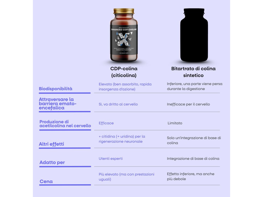 - Multivitaminico : aiuta a reintegrare altri micronutrienti chiave coinvolti nel metabolismo energetico e nella vitalità generale, rendendo la colina uno strumento ancora più efficace per il cervello e il corpo.