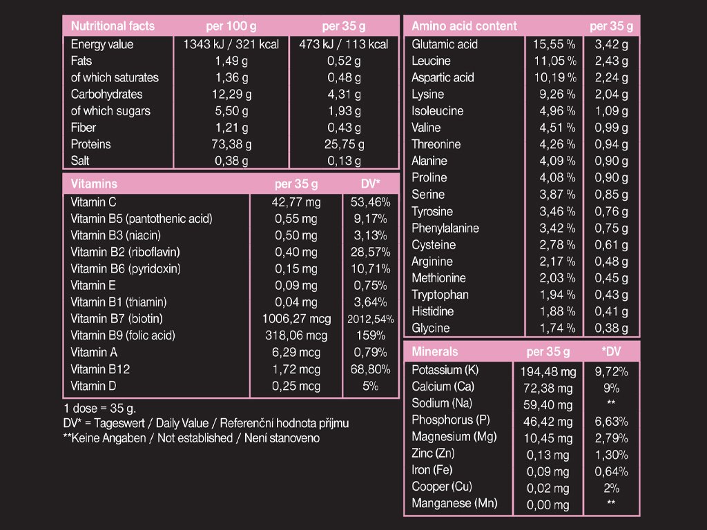 Mescolare 1 misurino (35 g) con 200 ml di acqua o latte. Considerando l'apporto giornaliero di proteine, assumere 1-3 dosi al giorno. Può essere utilizzato non solo dopo l'allenamento, ma anche nella preparazione di porridge per la colazione, smoothie, o anche durante la cottura per arricchire torte e dolci classici con proteine preziose.