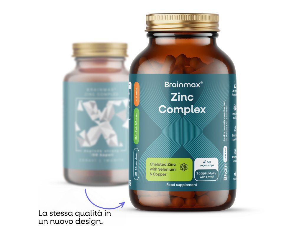 Zinc Complex® contiene 15 mg di zinco sotto forma di bisglicinato, 1 mg di rame come citrato di rame, 100 µg di selenio come L-selenometionina e 420 mg di curcuma bio. Lo zinco contribuisce alla normale funzione del sistema immunitario, alla protezione delle cellule dallo stress ossidativo, alla normale fertilità e riproduzione, al mantenimento di normali livelli di test0sterone nel sangue e al normale stato della pelle, dei capelli e delle unghie. Il selenio contribuisce alla normale funzione della tiroide, alla protezione delle cellule dallo stress ossidativo e alla normale spermatogenesi. Il rame contribuisce al normale trasporto del ferro nel corpo e al normale metabolismo energetico.