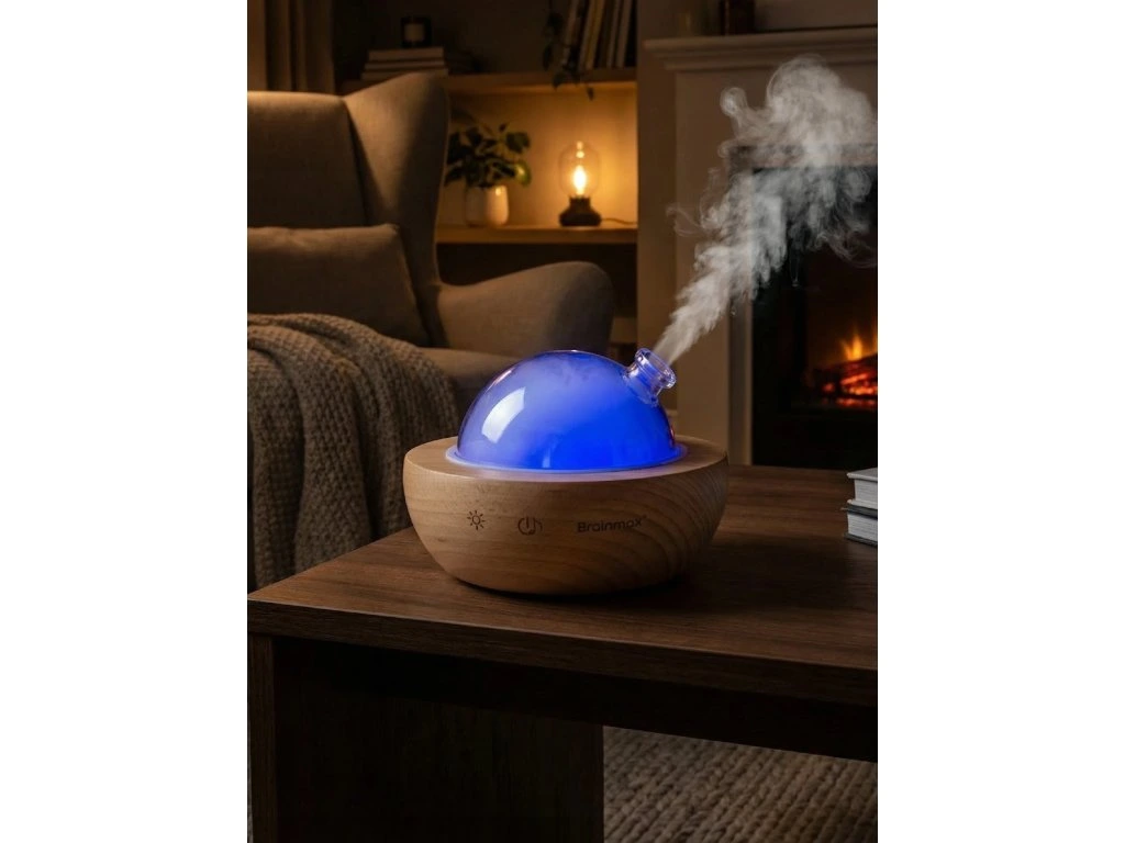 Ravviva ogni interno domestico. Legno di faggio naturale e elegante semisfera di vetro. Questo è il diffusore di aromi BrainMax, che funziona con acqua e olio essenziale. Questa combinazione garantisce non solo un'umidificazione dell'aria, ma riempie anche la stanza di profumo.