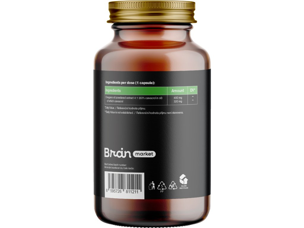 Composizione per dose (1 capsula): Estratto di olio di origano in polvere 4:1 (80% carvacrolo nell'olio) (400 mg, VNR **), di cui carvacrolo (320 mg, VNR **), maltodestrina di mais. Capsula vegetale a base di HPMC. Non contiene additivi (E-numbers).