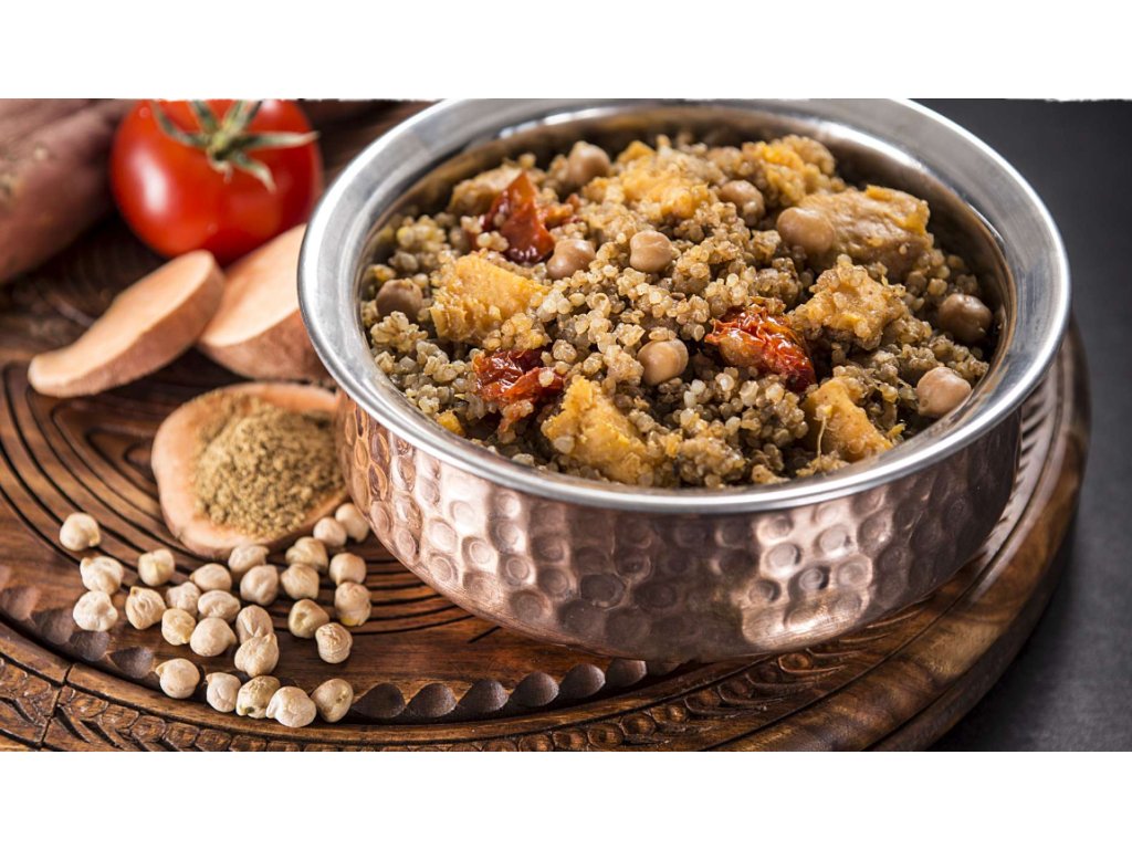 Dietro il nome esotico si nasconde il nostro primo piatto vegano. Ma anche un classico commensale con una dieta a base di carne non deve averne paura. La quinoa è uno dei cereali più antichi del Sud America ed è molto ricco di calcio e proteine. Inoltre, la quinoa è anche una preziosa fonte di magnesio, ferro, fosforo e molte vitamine. In combinazione con ceci, spezie garam masala, patate dolci nutrienti, zucchero di canna, sale dell'Himalaya e olio d'oliva, si ottengono 400 g di cibo non solo sano, ma anche energeticamente ben bilanciato. Prova a sfatare il mito secondo cui il cibo vegano non è gustoso.