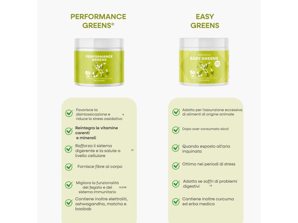 Performance Greens® è una miscela di super piante verdi per supportare l'immunità 2, l'energia 2, la digestione 2, la produzione di emoglobina 2, la funzionalità cardiaca ed epatica 2 livelli stabili di zucchero nel sangue 7, la disintossicazione dell'organismo 2 e, grazie al sale celtico e al concentrato del Great Salt Lake, anche dosi di minerali che contribuiscono all'equilibrio dei liquidi corporei, alla pressione sanguigna e al mantenimento del corretto pH del sangue. Oltre ai supercibi verdi, contiene anche ashwagandha. Un adattogeno con un alto contenuto di antiossidanti, rafforza l'organismo, supporta le funzioni dell'apparato riproduttivo e la concentrazione.