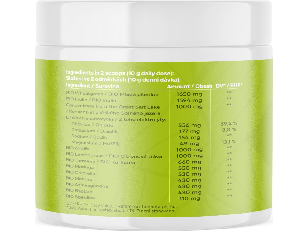 Composizione: Grano giovane*, inulina*, concentrato di Great Salt Lake (cloruro, potassio, sodio, magnesio), erba medica*, citronella*, curcuma*, moringa*, clorella*, matcha*, ashwaganda*, baobab*, acido citrico, edulcorante: glicosidi steviolici, aroma naturale, spirulina*, sale secco celtico. *prodotti da agricoltura biologica.