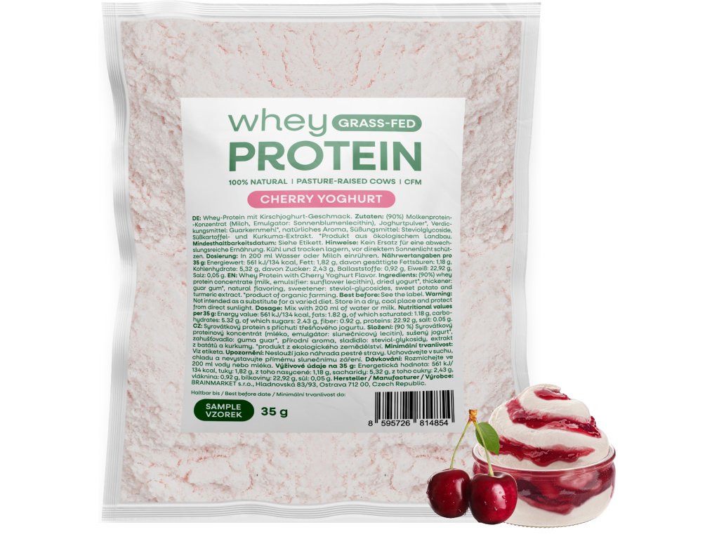 Proteine del siero del latte di erba BrainMax, yogurt alla ciliegia, 35 g, CAMPIONE Proteine microfiltrate non denaturate da latte di mucche alimentate ad erba, integratore alimentare